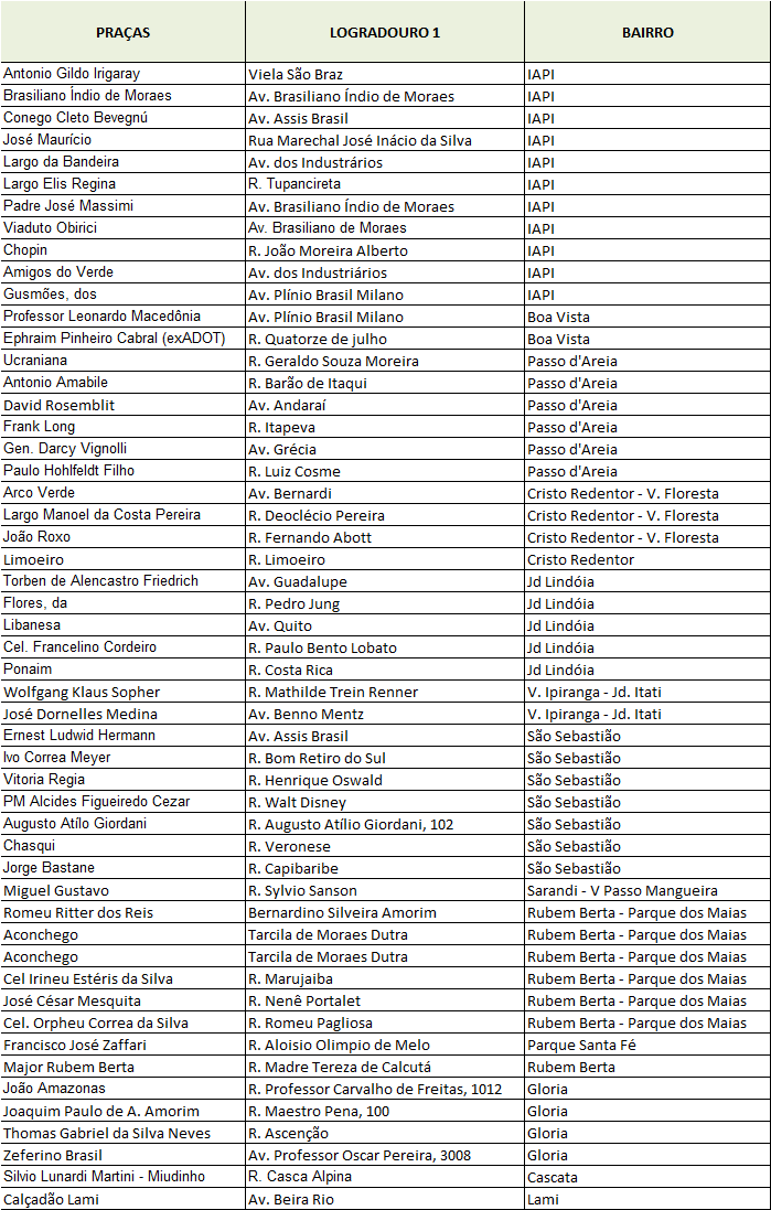 De 4 de dezembro a 9 de dezembro, estão programadas 52 praças localizadas em bairros como IAPI, Boa Vista, Passo d’Areia, Cristo Redentor, Vila Floresta, Jardim Lindóia, Vila Ipiranga, Jardim Itati, São Sebastião, Sarandi, Vila Passo da Mangueira, Rubem Berta, Parque dos Maias, Parque Santa Fé, Glória, Cascata e Lami. A SMSUrb aponta, no entanto, que a programação pode sofrer alterações devido às condições climáticas. Os serviços compreendem limpeza geral, capina e roçada, pelo Departamento Municipal de Limpeza Urbana (DMLU), e manutenção de lâmpadas e posteamento de luz, pela Divisão de Iluminação Pública (DIP). Serviço - Porto Alegre possui mais de 600 praças e a previsão é de que sejam atendidos 200 locais por mês. Neste caso, os serviços devem ocorrer a cada três meses, de segunda-feira a sábado até o meio-dia. A SMSUrb, por meio do DMLU, é a pasta responsável pela manutenção das praças, e a limpeza é feita por contrato de equipes que realizam a manutenção rotativa dos locais. Os oito parques do município têm equipes próprias de serviços, mantidas pela Secretaria do Meio Ambiente e da Sustentabilidade (Smams).