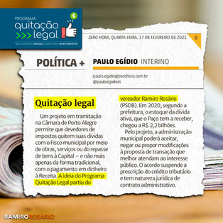 Com a sanção do Programa Quitação Legal pelo prefeito Sebastião Melo, nesta quinta-feira, 28, no Paço Municipal, Porto Alegre pode ganhar investimentos milionários. Isso porque o Lei 13.051/2022, de autoria do vereador Ramiro Rosário (PSDB), prevê a possibilidade de pagamento de dívidas com bens, serviços e obras na Capital.